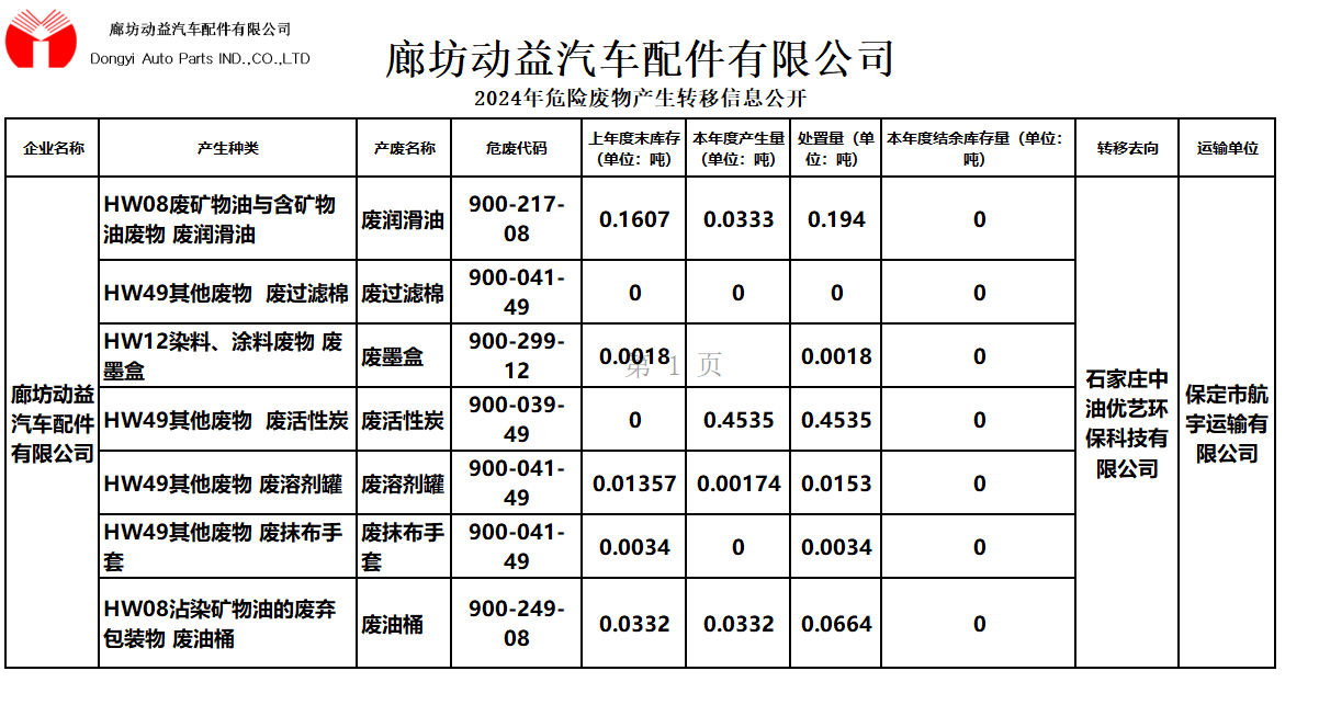 2024年上半年廊坊动益危险废物产生转移信息公开