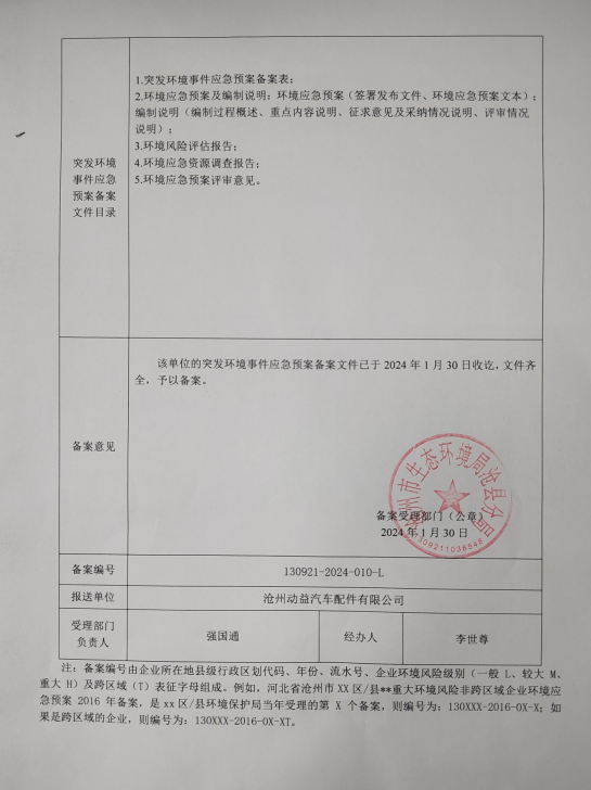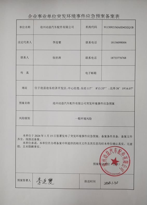 企业事业单位突发环境事件应急预案备案表
