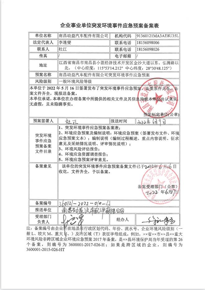 2022年南昌动益汽车配件有限公司-企业事业单位突发环境事件应急预案备案表