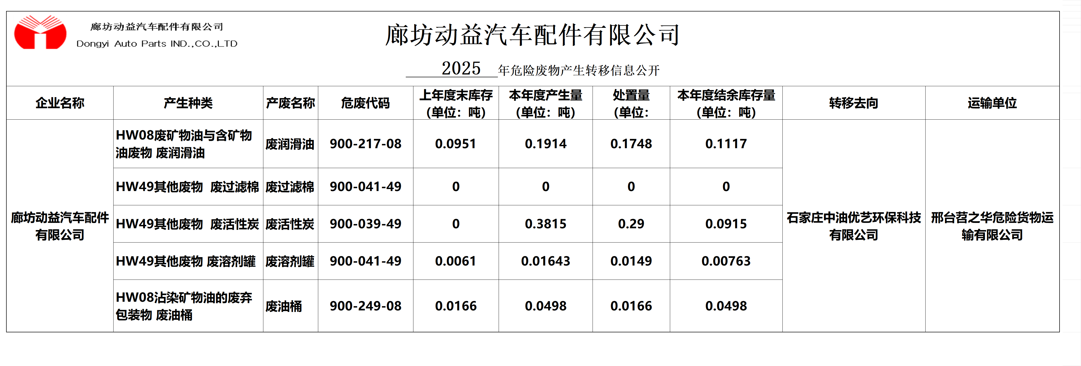 2025年下半年廊坊动益危险废物产生转移信息公开