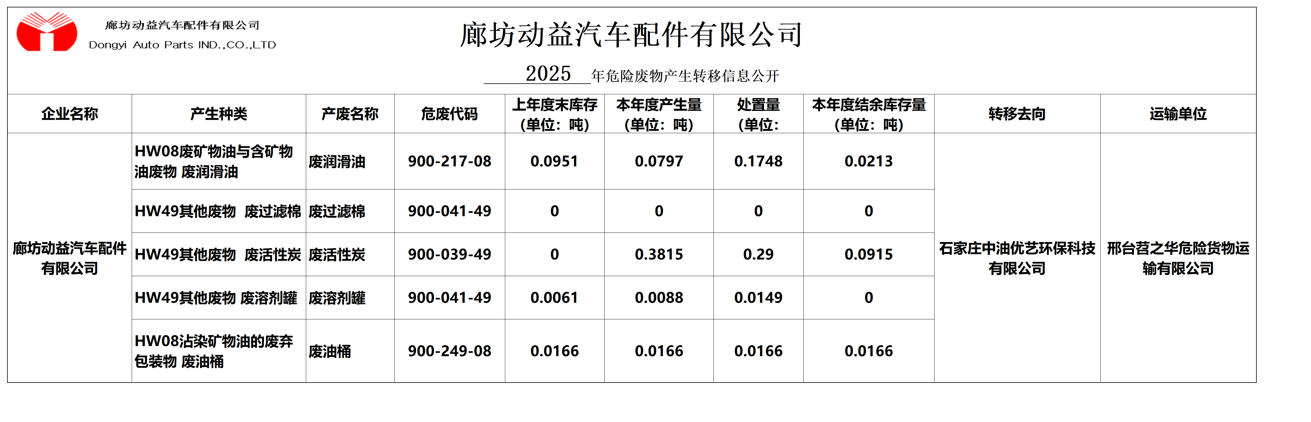 2025年上半年廊坊动益危险废物产生转移信息公开