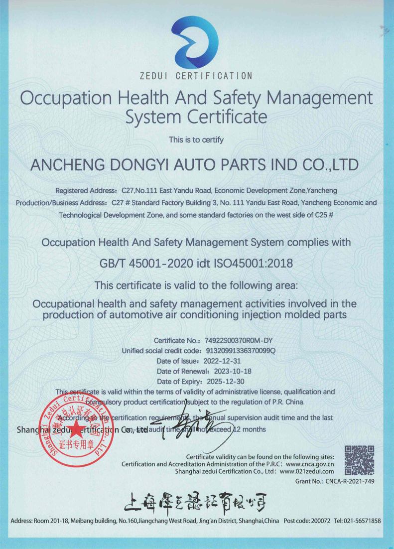 盐城动益职业健康安全管理体系证书